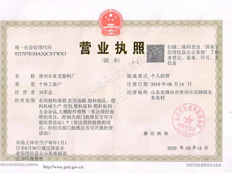 青州市亞龍塑料廠(chǎng)產(chǎn)品分為大棚膜系列和地膜系列。大棚膜產(chǎn)品有:醋酸乙烯高溫棚膜、PO膜、茂金屬耐老化滴膜、聚乙烯耐老化流滴膜、茂金屬專(zhuān)用膜等;地膜分為:聚乙烯地面覆蓋膜、黑色除草地膜、流滴地膜、黑白相間地膜、銀灰地膜等。并且公司近年來(lái)開(kāi)發(fā)的灌漿膜消霧好,流滴效果持久,使用壽命長(zhǎng)。生物降解地膜更是中國(guó)地膜生產(chǎn)行業(yè)一次技術(shù)革命,根除了白色污染,提高了作物產(chǎn)量,在廣大消費(fèi)者中享有極好的美譽(yù)